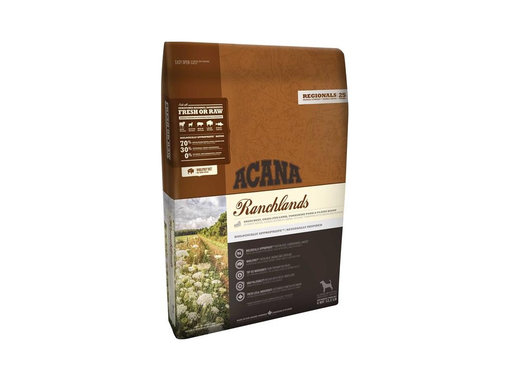 Acana Dog Ranchlands je krmivo bez obilnín. Obsahuje hovädzie, bizónie a jahňacie mäso bez konzervantov, 40% ovocia a zeleniny, vrátane jabĺk Red Delicious, hrušiek Bartlett maslovej tekvice, zemiakov Burbank a listov špenátu . Bohaté na obsah proteínov a nízky obsah sacharidov.