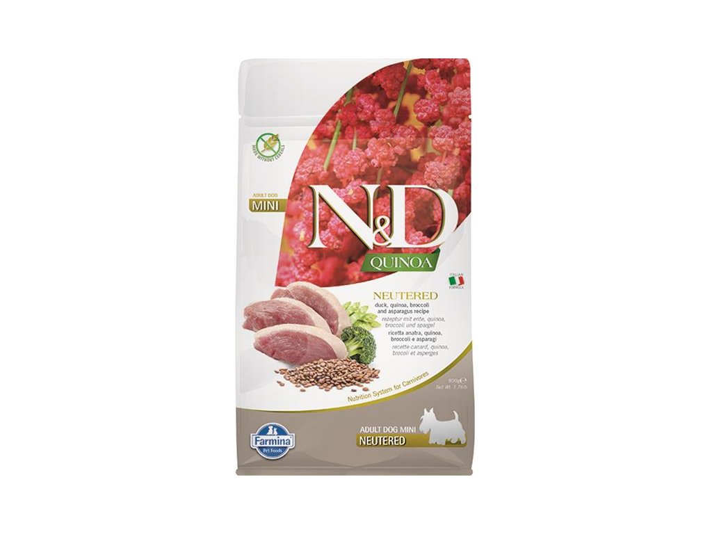 Farmina N&D dog QUINOA (GF) adult mini, neutered, duck, broccoli & asparagus 0,8 kg