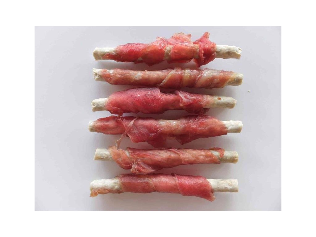 Zloženie: králičie mäso 65%, byvolia koža 30%, rastlinný proteín 3%, glycerín 1%, soľ 1%.