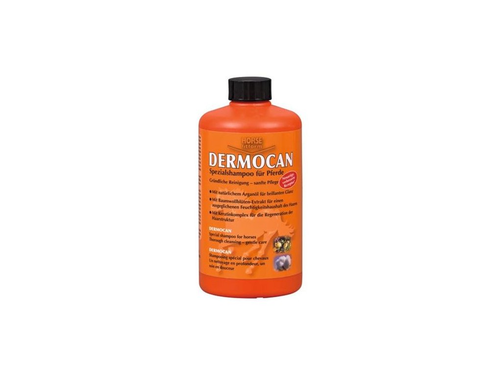 - Srsť sa namočí vlažnou vodou. Potom votrite do srsti dôkladne šampón DERMOCAN a po niekokých minútach opláchnite vodou a ešte raz naneste DERMOCAN až vznikne hustá pena, ktorú nechajte pôsobiť niekoľko minút. Teraz sa kôň dôkladne spláchne vlažnou vodou a následne sa z neho zotrie voda sťahovákom na pot.